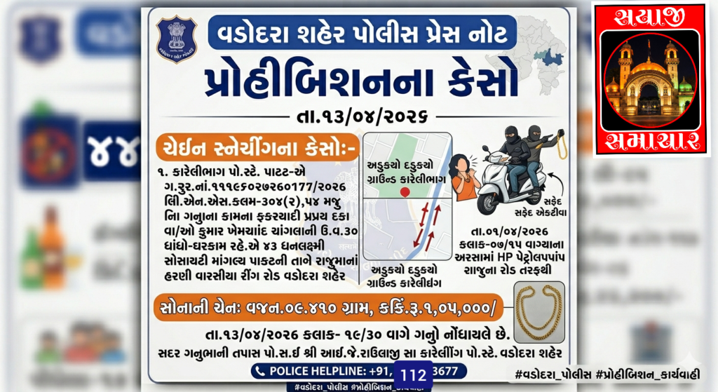 કારેલીિાગ પો.સ્ટે. પાટટ-એ ગ.ુર.નાં.૧૧૧૯૬૦૨૭૨૬૦૧૭૭/૨૦૨૬િી.એન.એસ.કલમ-૩૦૪(૨),૫૪ મજુ િના